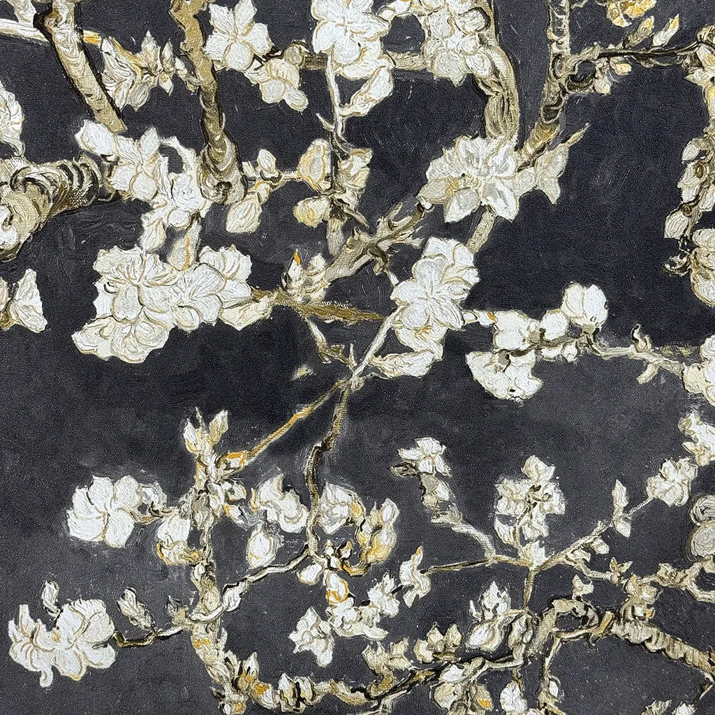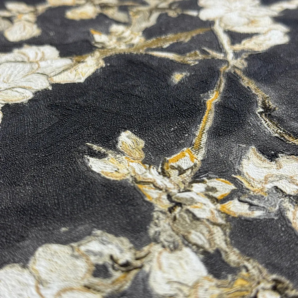 黒に近い深い背景に、白いアーモンドの花が浮かび上がるように描かれたデザイン。ゴッホの名作《花咲くアーモンドの枝》をモチーフにした壁紙は、クラシカルでありながらモダンな表情を持ち、空間に気品と存在感を添えます。アートの持つ力強さを、インテリアとして日常に取り入れることができます。